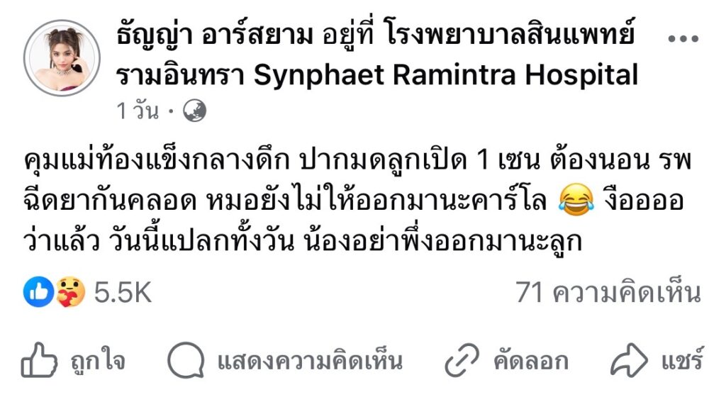นอกจากนี้ สาว “ธัญญ่า อาร์สยาม” ยังอัดคลิปแชร์ประสบการณ์เตือนคุณแม่ และเล่าเหตุการณ์ที่กิดขึ้นว่า “มีอาการท้องแข็งตั้งแต่ประมาณ 5 ทุ่ม คิดว่าลูกดิ้นหรือโก่งตัว แต่เริ่มปวดบิดมากจนท้องเบี้ยว และคลายแล้วก็ปวดบีบใหม่ ตอนแรกว่าจะไม่มา แต่เริ่มเจ็บแปลกๆแบบไม่เคยเจ็บมาก่อนเลยมา รพ. พอมาหมอบอกว่าปากมดลูกเปิด 1 เซ็นแล้ว แม่ๆคนไหนที่มีอาการแปลกๆ แนะนำให้มา รพ.เลยนะ เพราะอันตรายมาก แต่ตอนนี้ดีขึ้นแล้ว คุณหมอก็ให้ยา และรอดูอาการแล้วจะมาอัปเดตอีกที”