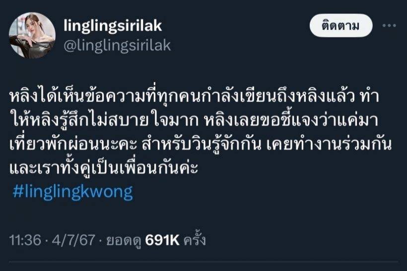 ต่อมา หลิงหลิง ก็ได้ออกมาชี้แจงว่า “ได้เห็นข้อความที่ทุกคนกำลังเขียนถึงแล้ว ทำให้รู้สึกไม่สบายใจมากเลยขอชี้แจงว่าแค่มาเที่ยวพักผ่อนนะคะ สำหรับวินรู้จักกัน เคยทำงานร่วมกันและเราทั้งคู่เป็นเพื่อนกันค่ะ