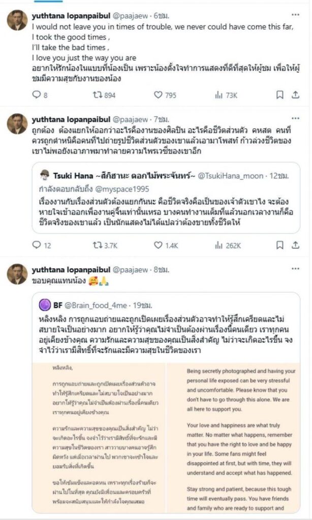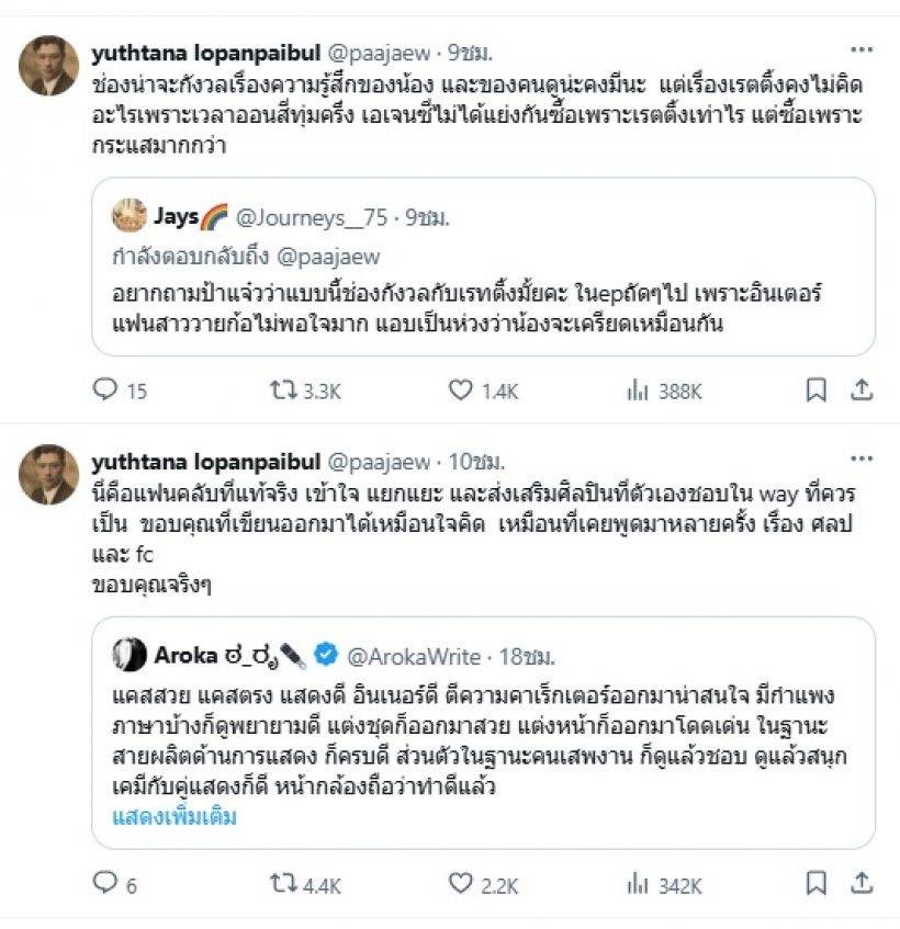 ขณะเดียวกัน ทางด้านผู้กำกับและผู้จัดละครชื่อดัง “ป้าแจ๋ว ยุทธนา”ก็ได้ออกมาตอบแฟนคลับว่า “นี่คือแฟนคลับที่แท้จริง เข้าใจ แยกแยะ และส่งเสริมศิลปินที่ตัวเองชอบใน way ที่ควรเป็น ขอบคุณที่เขียนออกมาได้เหมือนใจคิด เหมือนที่เคยพูดมาหลายครั้ง เรื่อง ศลป และ fc ขอบคุณจริง ๆ”