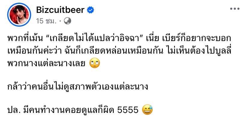 และฟาดต่ออีกโพสต์ว่า “พวกที่เมนต์ “เกลียดไม่ได้แปลว่าอิจฉา” เนี่ย เบียร์ก็อยากจะบอกเหมือนกันค่ะว่า ฉันก็เกลียดหล่อนเหมือนกัน ไม่เห็นต้องไปบูลลี่พวกนางแต่ละนางเลย กล้าว่าคนอื่นไม่ดูสภาพตัวเองแต่ละนาง ป.ล. มีคนทำงานคอยดูแลก็ผิด 5555”