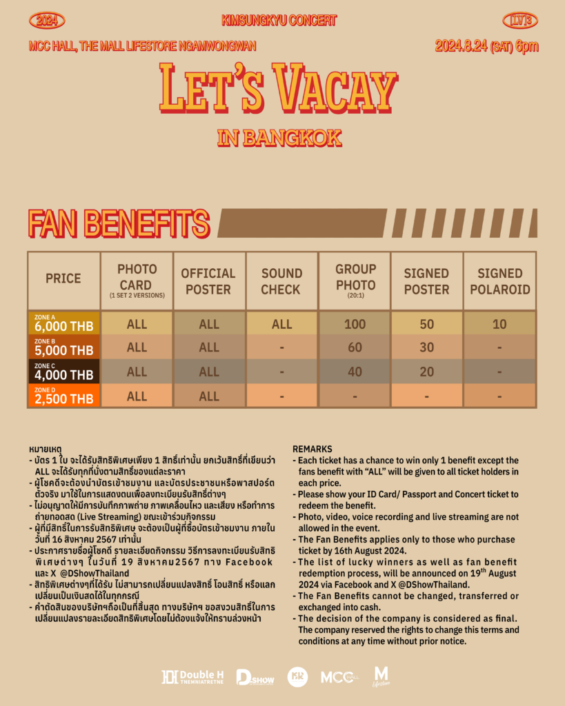 ปักหมุดที่ไทยอย่างแน่นอนแบบนี้แล้ว อินสปริตไทยเริ่มเขียนใบลากันได้เลย เพราะลีดเดอร์เสียงดีคนนี้จะมาทำให้ช่วงเวลาวันหยุดของคุณครั้งนี้เป็นวันหยุดที่สุดแสนประทับใจอีกหนึ่งครั้ง 2024 KIM SUNG KYU CONCERT [LV3 : Let’s Vacay] TOUR IN BANGKOK คอนเสิร์ตเดี่ยวครั้งแรกของเขาที่ไทย จดวันที่ให้ดีๆ แล้วไปเจอกันในวันเสาร์ที่ 24 สิงหาคม 2567 เวลา 18:00 น. ณ MCC HALL, เดอะมอลล์ไลฟ์สโตร์ งามวงศ์วาน จำหน่ายบัตรพร้อมกันในวันเสาร์ ที่ 20 กรกฎาคม 2567 เวลา 10.00 น. ทางไทยทิคเก็ตเมเจอร์ทุกสาขาและ เว็บไซต์ www.thaiticketmajor.com โดยราคาบัตรจะมีตั้งแต่ 6,000, 5,000, 4,000, และ 2,500 บาท พร้อมสิทธิ์ Sound Check สำหรับบัตร 6,000 บาท ทุกที่นั่ง ติดตามรายละเอียดสิทธิพิเศษต่างๆ เพิ่มเติมได้ทาง https://www.facebook.com/DSHOWTHAILAND และ X: @DshowThailand แล้ววันหยุดพักร้อนของคุณครั้งนี้จะไม่เหมือนเดิมอีกต่อไป