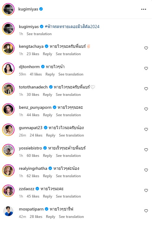 “ขอบคุณสำหรับทุกกำลังใจที่ส่งมานะครับ สำหรับงานถ่าย และงานโชว์ตัวอื่นๆ ผมยังทำได้ปกติครับ สุขภาพทุกอย่างปกติเพียงแค่มีเฝือกที่นิ้วมือขวาเท่านั้น รอเจอกับผู้ชมฟ้าจรดทรายทุกท่านอีกครั้งนะครับ ขอบคุณครับ”