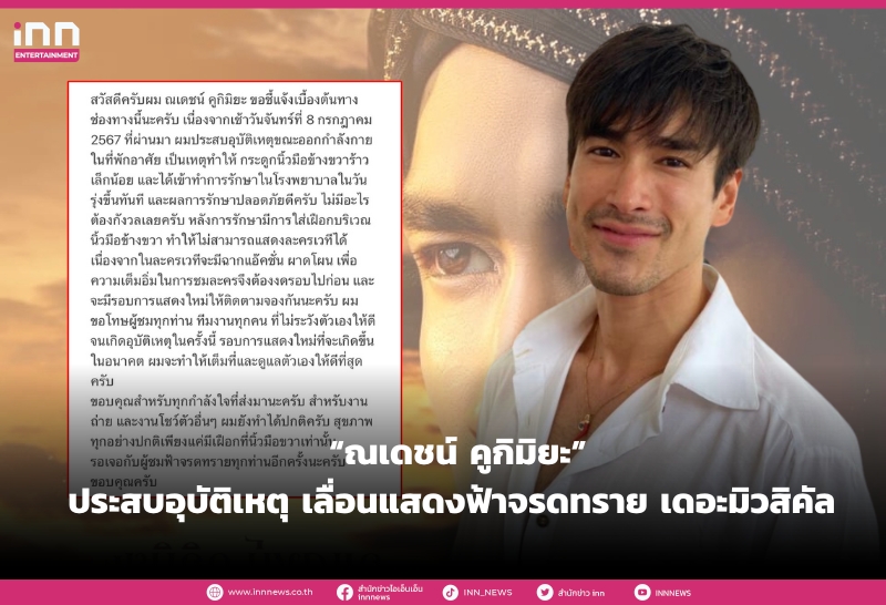 “สวัสดีครับ ณเดชน์ คูกิมิยะ ขอชี้แจ้งเบื้องต้นทางช่องทางนี้นะครับ เนื่องจากเช้าวันจันทร์ที่ 8 กรกฎาคม 2567 ที่ผ่านมา ผมประสบอุบัติเหตุขณะออกกำลังกายในที่พักอาศัย เป็นเหตุทำให้กระดูกนิ้วมือข้างขวาร้าวเล็กน้อย และได้เข้าทำการรักษาในโรงพยาบาลในวันรุ่งขึ้นทันที”