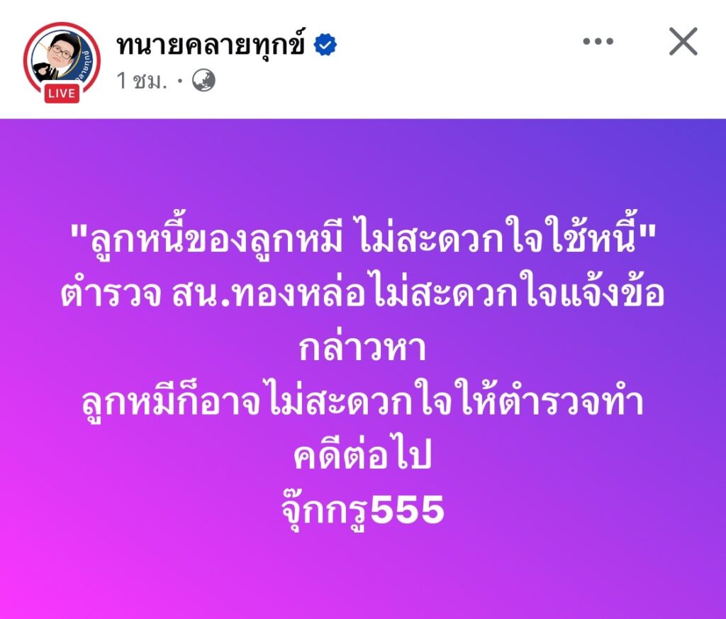 ล่าสุด ทนายเดชา ทนายความของ ลูกหมี รัศมี ได้โพสต์ข้อความว่า “ลูกหนี้ของลูกหมี ไม่สะดวกใจใช้หนี้”  ตำรวจ สน.ทองหล่อไม่สะดวกใจแจ้งข้อกล่าวหา  ลูกหมีก็อาจไม่สะดวกใจให้ตำรวจทำคดีต่อไป จุ๊กกรู555