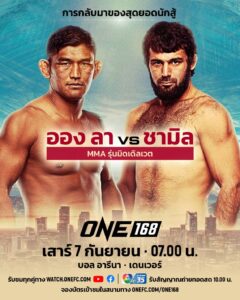 โดยไฟต์นี้ “ออง ลา” พร้อมพิสูจน์ให้ทุกคนเห็นอีกครั้งว่าในวัย 39 ปี เขายังคงเป็นนักสู้ตัวอันตรายในรุ่นมิดเดิลเวต ที่คู่ต่อสู้ไม่สามารถมองข้ามได้ ขณะที่ “ชามิล” นี่คือโอกาสสำคัญที่เขาจะสร้างชื่อบนเวทียิ่งใหญ่ระดับโลก ด้วยการเอาชนะนักสู้ดีกรีอดีตราชันของรุ่นนี้ ซึ่งในตอนจบ ฝ่ายจอมเก๋าหรือดาวรุ่งไฟแรงจะได้รับการชูมือ แฟนกีฬาการต่อสู้ร่วมลุ้นใจระทึกไปพร้อมกันในศึก ONE 168 วันเสาร์ที่ 7 ก.ย.67
