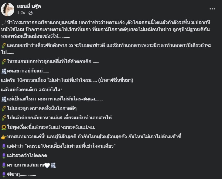 บทสนทนาจบแค่นี้! แอนรู้นิสัยลูกดี ถ้าอันไหนสู้จะสู้จนสุดตัว อันไหนไม่เอาไม่ต้องเซ้าซี้ แต่คำว่า ‘คนรวย 10 คนเลี้ยงไม่เท่าแม่ที่เข้าใจคนเดียว’ แม่จะจดจำไปตลอด ตราบนานแสนนาน ฑีฆายุ……………”