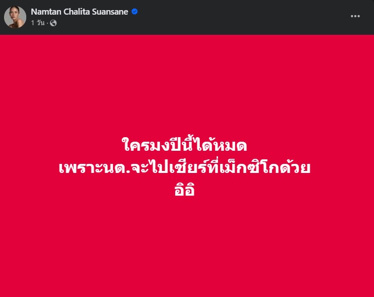 นอกจากนี้เธอยังบอกอีกว่า “ใครมงปีนี้ได้หมด เพราะนต.จะไปเชียร์ที่เม็กซิโกด้วย อิอิ”