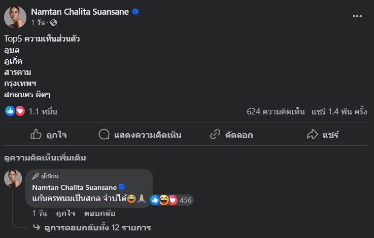 โดยเธอเน้นย้ำว่านี่คือความคิดเห็นส่วนตัว และบอกว่า “แต่ใจชอบสกลสุด เพราะสวยแบบนางพญา ไปลุ้นตอบคำถามเอา เพราะเบาจนไม่มีใครโดดออกมาขนาดนั้น ห้ามดราม่าดูตามหน้างาน”