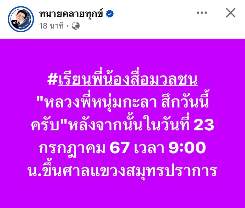 โดยทาง ทนายเดชา ก็ได้มีการโพสต์ข้อความผ่านเฟซบุ๊ก ว่า #เรียนพี่น้องสื่อมวลชน “หลวงพี่หนุ่มกะลา สึกวันนี้ครับ”หลังจากนั้นในวันที่ 23 กรกฎาคม 67 เวลา 9:00 น.ขึ้นศาลแขวงสมุทรปราการ