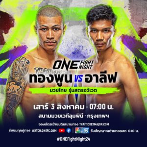 เตรียมระเบิดความมันสำหรับศึกใหญ่ ONE Fight Night 24 ที่จะถ่ายทอดสดจากสนามมวยเวทีลุมพินี (รามอินทรา) ในช่วงไพรม์ไทม์อเมริกา ซึ่งตรงกับช่วงเช้าเวลา 07.00 น. ในเช้าวันเสาร์ที่ 3 ส.ค.นี้ โดยล่าสุดมีการประกาศการประกบคู่ระหว่าง “ทองพูน พีเค.แสนชัย” นักชกทรงอย่างแบด วัย 26 ปี จากมหาสารคาม และ “อาลีฟ ส.เดชะพันธ์” มวยบู๊พลังสด วัย 20 ปี เชื้อสายไทย – มาเลเซีย ในกติกามวยไทย รุ่นสตรอว์เวต (115-125 ป.)