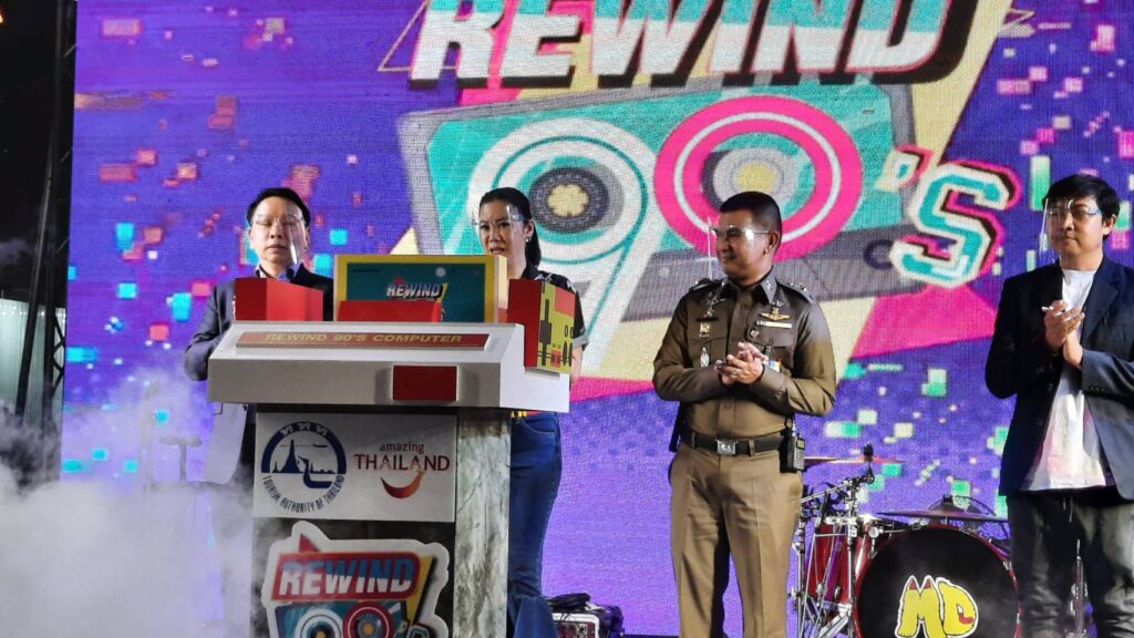 โดยนางสาวฐาปนีย์ เกียรติไพบูลย์ รองผู้ว่าการ ททท. ด้านสินค้าและธุรกิจท่องเที่ยว กล่าวว่า ในการจัดงานครั้งนี้ทาง ททท. โดยนายยุทธศักดิ์ สุภสร ผู้ว่าการ ททท. ได้ให้การสนับสนุนการจัดงานดังกล่าวขึ้น เพื่อเป็นการกระตุ้นเศรษฐกิจด้านการท่องเที่ยวให้กลับมาสู่ภาวะปกติโดยเร็ว ซึ่งภายในงานได้เปิดให้ความรู้เกี่ยวกับมาตรฐาน SHA หรือAmazing Thailand Safety & Health Administrat รวมถึงการแสดงดนตรีโฟล์คซอง อะคูสติกส์ และกิจกรรมต่างๆอาทิ โซนฉายภาพเก่า ชมหนังกลางแปลง ความสุขในวัยวันวานคงหนีไม่พ้นเรื่องของหนังเก่า ที่รวมความทรงจำดีๆท่ามกลางบรรยากาศที่ตกแต่งโดยรอบให้นักท่องเที่ยวได้ประทับใจ ,โซนของเล่นแบ่งกันเด่น สนุกขนาดไหนหากได้เล่นของเล่นในความทรงจำ กับเพื่อนอีกครั้ง ทั้งตู้เกม เครื่องเกม Play ทามาก็อตจิ และอีกมากมาย ที่ล้วนเต็มไปด้วยเรื่องราวของความทรงจำ ,โซนย้อนวัยกลับไปวันวาน กับภาพจากกล้องฟิล์มมุมถ่ายรูปสุดเก๋ที่ถูกแต่งเติมไปด้วยสีสันและกลิ่นอายวินเทจ ที่จะมาเติมเต็ม ,โซนตู้ถ่ายรูปสติ๊กเกอร์ ภาพถ่ายที่ทำให้คิดถึง ยามเด็กเรามักจะชวนเพื่อนไปถ่ายด้วยกันเสมอ หรือแม้กระทั่งคู่รัก ที่ในสมัยนั้นคงจะต้องมีรูปคู่ติดกระเป๋ากันเกือบทุกคน ,โซน 90’s Songs แนวเพลงขุด 90 อีกหนึ่งเสน่ห์ของความคลาสสิก แนวเพลงยุค 90 อีกหนึ่งเสน่ห์แห่งความคลาสสิก เทปเพลงคาสเซ็ท และศิลปินในยุคนั้นที่น่าหลงใหล และโซน 90’s Street Market ตลาดที่ตกแต่งสไตล์วินเทจแบบ 90’s เต็มไปด้วย ของเล่นโบราณ ขนม และอาหารแสนอร่อยในวันวานที่หลายคนต่างคิดถึง นอกจากนี้ภายในงานยังแต่งกายธีมแฟชั่นย้อนยุค90’s จึงเชิญชวนให้ร่วมกิจกรรมทางเฟซบุ๊กแฟนเพจ “Rewind 90’s ย้อนวันกลับไปวันวาน“