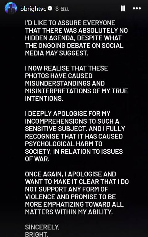 เรียกว่าเป็นดราม่าร้อนระอุพายุเข้าหนักมาก สำหรับนักแสดงหนุ่ม ไบร์ท วชิรวิชญ์“ไบร์ท วชิรวิชญ์” ที่ได้ออกมาโพสต์ภาพ คู่รถถังและอาวุธสงคราม ขณะไปเยี่ยมชมสนามยิงปืนและพิพิธภัณฑ์ทหารกลางแจ้ง BATTLEFIELD VEGAS พร้อมระบุแคปชั่นว่า “like a soldier” โซรีท่ามกลางชาวเน็ตเข้ามาต่อมาตำหนิสนั่นบนโลกออนไลน์ ทำนองว่าการถ่ายภาพคู่รถถัง อาจดูเหมือนเป็นการกำลังสนับสนุนสงครามระหว่างปาเลสไตน์ กับ อิสราเอล ที่ฉนวนกาซาอยู่หรือไม่