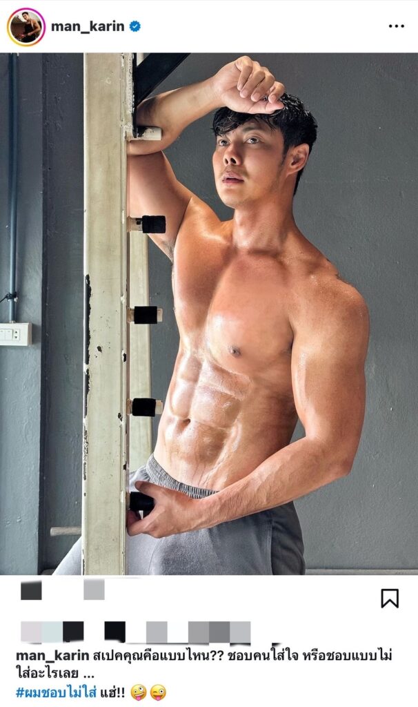 ซึ่ง แมน การิน เขียนแคปชันบรรยายว่า “ @man_karin สเปคคุณคือแบบไหน?? ชอบคนใส่ใจ หรือชอบแบบไม่ใส่อะไรเลย … #ผมชอบไม่ใส่ แฮ่!! “