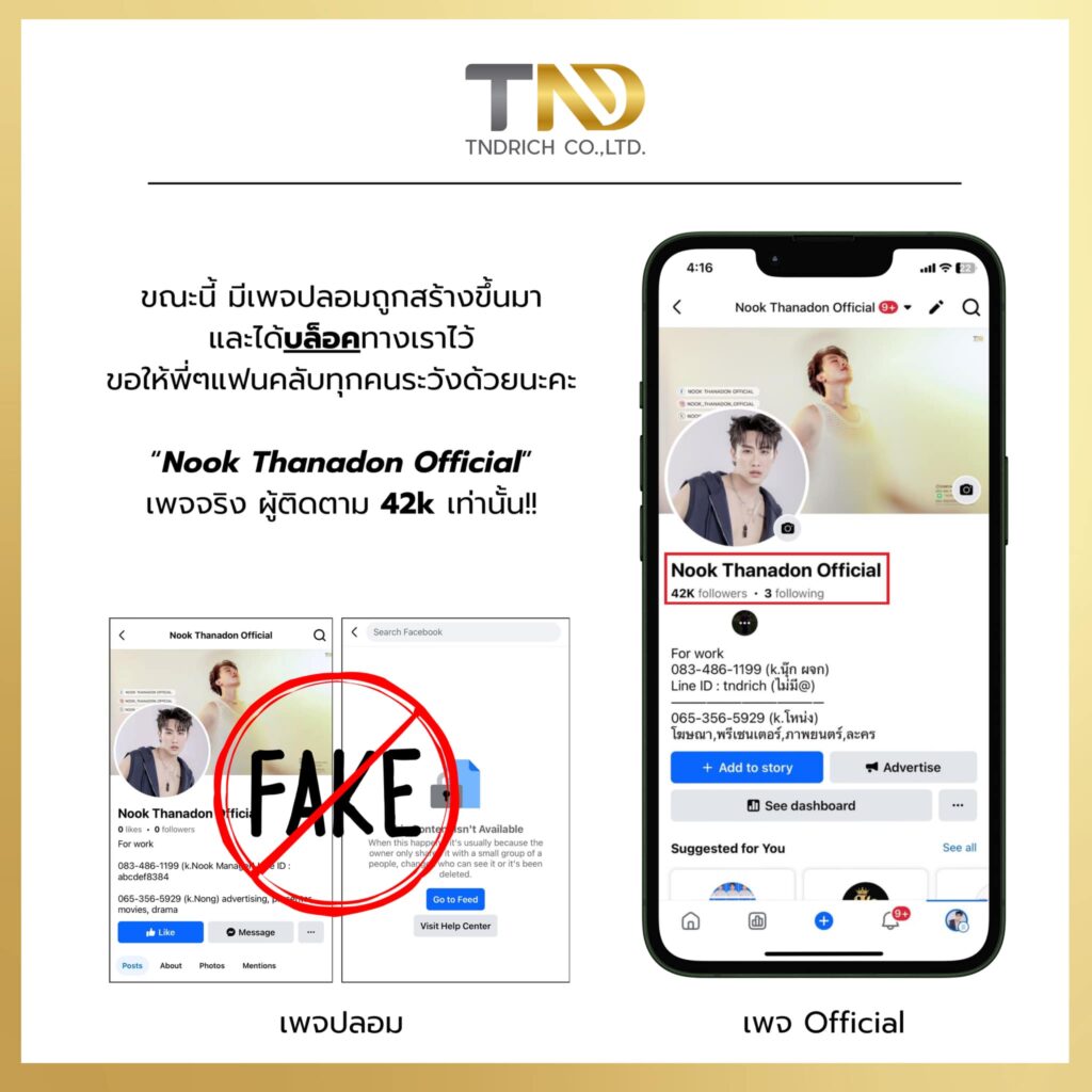 โดยได้แจ้งเตือนผ่านแฟนเพจ Nook Thanadon Official ระบุว่า…“ขณะนี้ มีคนได้สร้างเพจปลอมขึ้นมา ขอให้พี่ ๆ แฟนคลับทุกคน คอยระวังกันด้วยนะคะ เพจ Nook Thanadon Official เพจหลัก มีผู้ติดตาม 42k เท่านั้น! และได้เขียนใต้คอมเมนต์อีกว่า “หากพบเจอ สามารถกดรายงานได้เลยนะคะ”