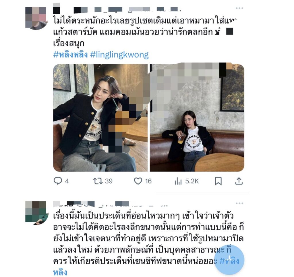 ต่อมาทางด้าน “หลิงหลิง” ได้ออกมาเคลื่อนไหวโดยการลบภาพดังกล่าว แล้วออกมาโพสต์ใหม่ โดยใช้สติ๊กเกอร์สุนัขปิดตรงแก้วกาแฟไม่ให้เห็นโลโก้แบรนด์ แต่ถึงยังไงชาวเน็ตก็ไม่วายเข้ามาแสดงความคิดเห็นกับประเด็นดังกล่าวอย่างต่อเนื่องและยังต่อว่าเป็นการแก้ปัญหาที่ไม่สมควร