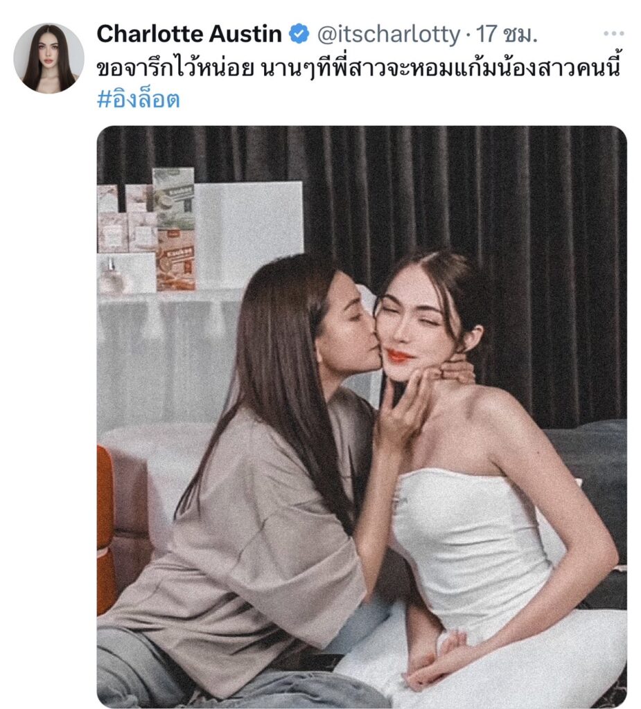 ต่อมา “ชาล็อต” ก้ได้ออกมาโพสตืภาพที่ “อิงฟ้า” หอมแก้มตัวเองลงในเอ็กซ์ พร้อมเขียนแคปชั่นว่า “ขอจารึกไว้หน่อย นานๆทีพี่สาวจะหอมแก้มน้องสาวคนนี้ #อิงล็อต”