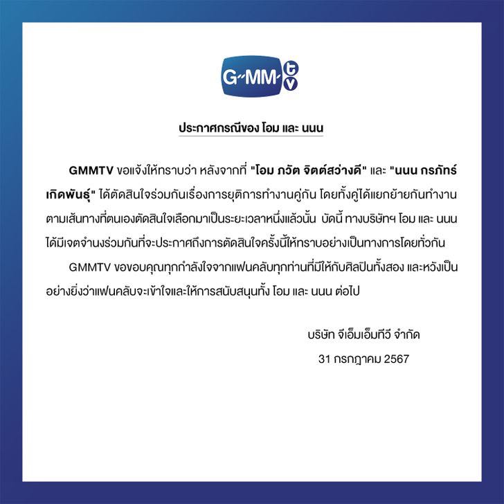 โดย “GMMTV” ได้ร่อนจดหมายว่า “GMMTV ขอแจ้งให้ทราบว่า หลังจากที่ “โอม ภวัต จิตต์สว่างดี” และ “นนน กรภัทร์ เกิดพันธุ์” ได้ตัดสินใจร่วมกันเรื่องการยุติการทำงานคู่กัน โดยทั้งคู่ได้แยกย้ายกันทำงานตามเส้นทางที่ตนเองตัดสินใจเลือกมาเป็นระยะเวลาหนึ่งแล้วนั้น บัดนี้ ทางบริษัทฯ โอม และ นนน ได้มีเจตจำนงร่วมกันที่จะประกาศถึงการตัดสินใจครั้งนี้ให้ทราบอย่างเป็นทางการโดยทั่วกัน