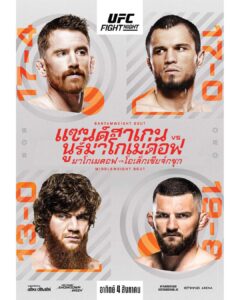 สำหรับศึก UFC FIGHT NIGHT : SANDHAGEN VS NURMAGOMEDOV จะระเบิดศึก ณ สังเวียน Etihad Arena ,เกาะยาส ,สหรัฐอาหรับ เอมิเรตส์ คืนวันเสาร์ที่ 3 สิงหาคมนี้ คู่หลักของรายการเริ่มเวลา 02.00 น. ตามเวลาประเทศไทย