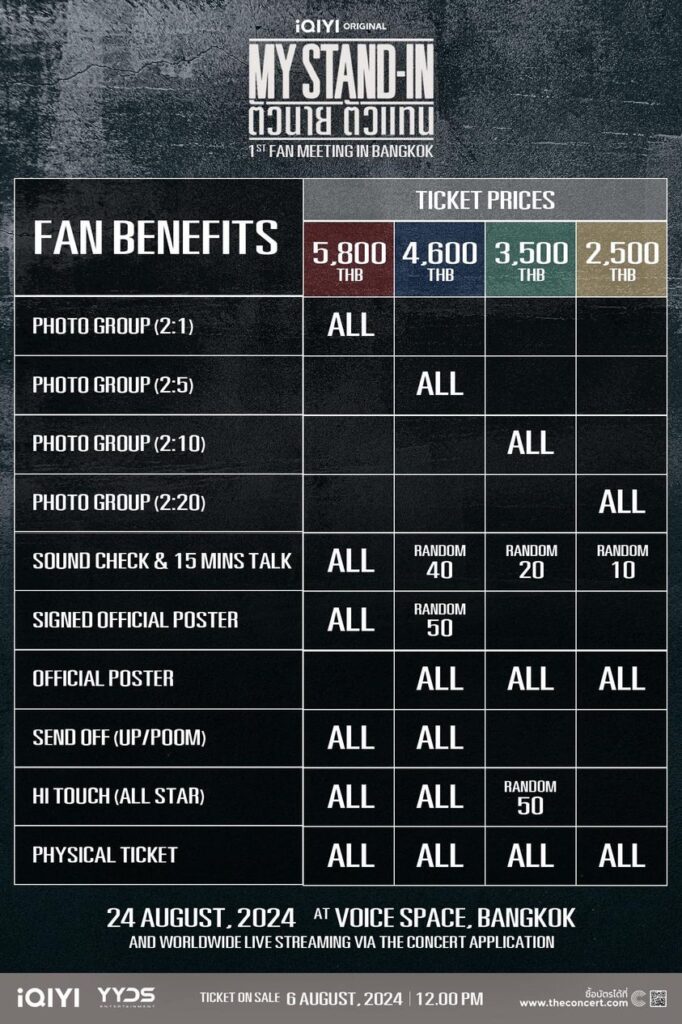 เปิดขายบัตรวันแรก 6 สิงหาคมนี้ บัตรราคา 5,800 / 4,600 / 3,500 / 2,500 บาท และ Live Streaming Ticket ราคา 790 บาท สามารถซื้อได้ผ่านทาง https://www.theconcert.com/ แฟน ๆ “MY STAND-IN ตัวนาย ตัวแทน” ห้ามพลาด งานนี้มีฟินกับฟิน