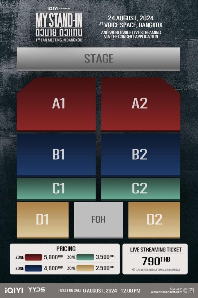 เปิดขายบัตรวันแรก 6 สิงหาคมนี้ บัตรราคา 5,800 / 4,600 / 3,500 / 2,500 บาท และ Live Streaming Ticket ราคา 790 บาท สามารถซื้อได้ผ่านทาง https://www.theconcert.com/ แฟน ๆ “MY STAND-IN ตัวนาย ตัวแทน” ห้ามพลาด งานนี้มีฟินกับฟิน