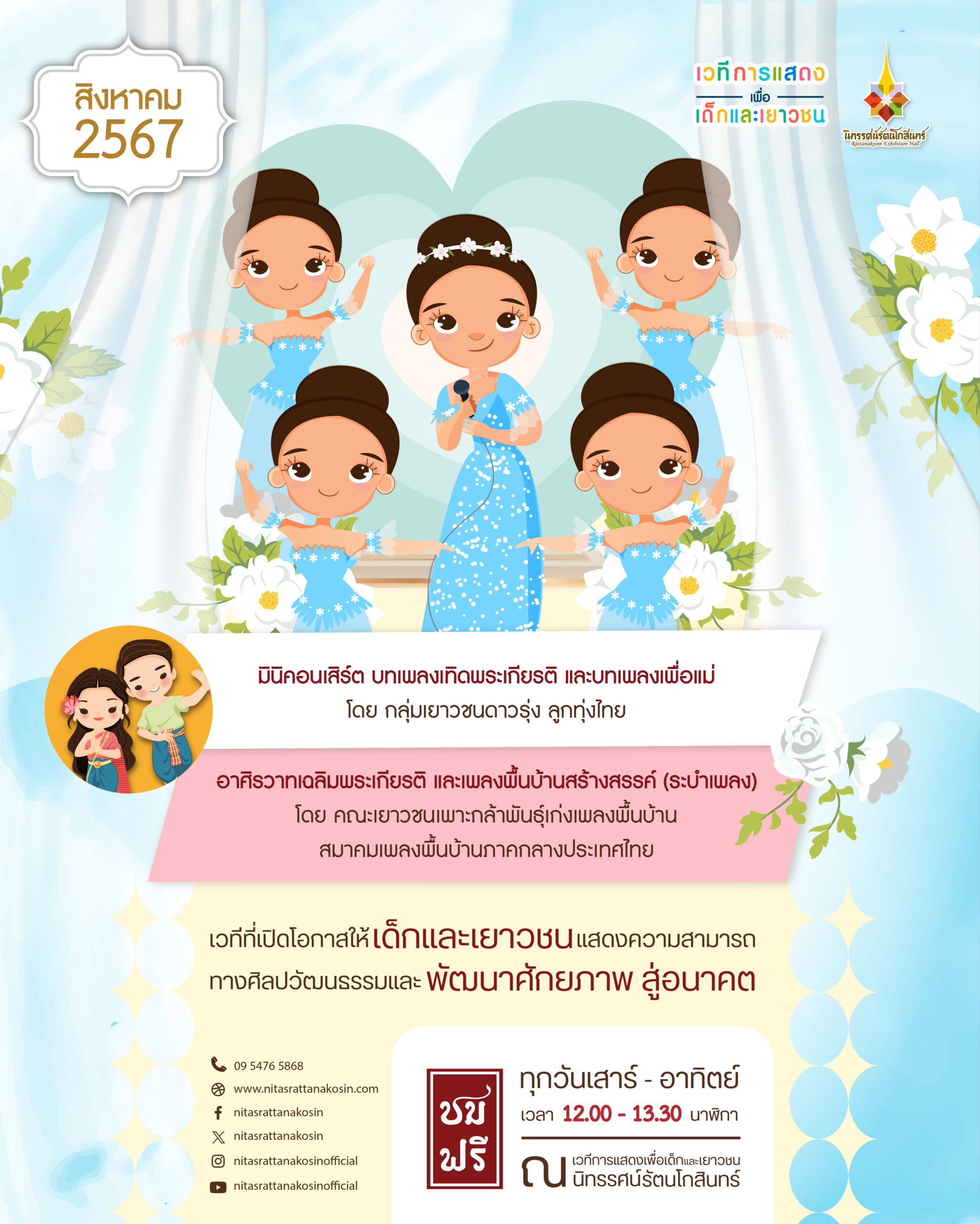 เวทีการแสดงเพื่อเด็กและเยาวชน นิทรรศน์รัตนโกสินทร์ เดือนสิงหาคมนี้ พบกับ มินิคอนเสิร์ต บทเพลงเทิดพระเกียรติ และบทเพลงเพื่อแม่ โดย กลุ่มเยาวชนดาวรุ่ง ลูกทุ่งไทย อาศิรวาท เฉลิมพระเกียรติ และเพลงพื้นบ้านสร้างสรรค์ (ระบำเพลง) โดย คณะเยาวชนเพาะกล้าพันธุ์เก่งเพลงพื้นบ้าน สมาคมเพลงพื้นบ้านภาคกลางประเทศไทย พร้อมทั้งการแสดงด้านศิลปวัฒนธรรมที่หลากหลาย ชมฟรี ทุกวันเสาร์ – อาทิตย์ เวลา 12.00 – 13.30 นาฬิกา สอบถามเพิ่มเติม โทร. 09 5476 5868