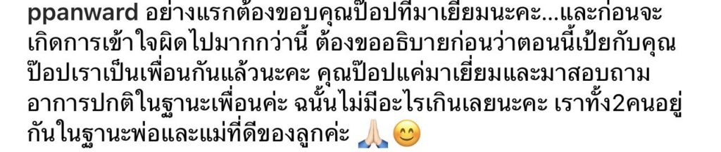 ล่าสุดสาว “เป้ย” ได้ออกมาโพสต์ภาพคู่ “ป๊อป” พร้อมชี้แจงว่า “อย่างแรกต้องขอบคุณป๊อปที่มาเยี่ยมนะคะ…และก่อนจะเกิดการเข้าใจผิดไปมากกว่านี้ ต้องขออธิบายก่อนว่าตอนนี้เป้ยกับคุณป๊อปเราเป็นเพื่อนกันแล้วนะคะ คุณป๊อปแค่มาเยี่ยมและมาสอบถามอาการปกติในฐานะเพื่อนค่ะ ฉนั้นไม่มีอะไรเกินเลยนะคะ เราทั้ง2คนอยู่กันในฐานะพ่อและแม่ที่ดีของลูกค่ะ 🙏🏻😊”