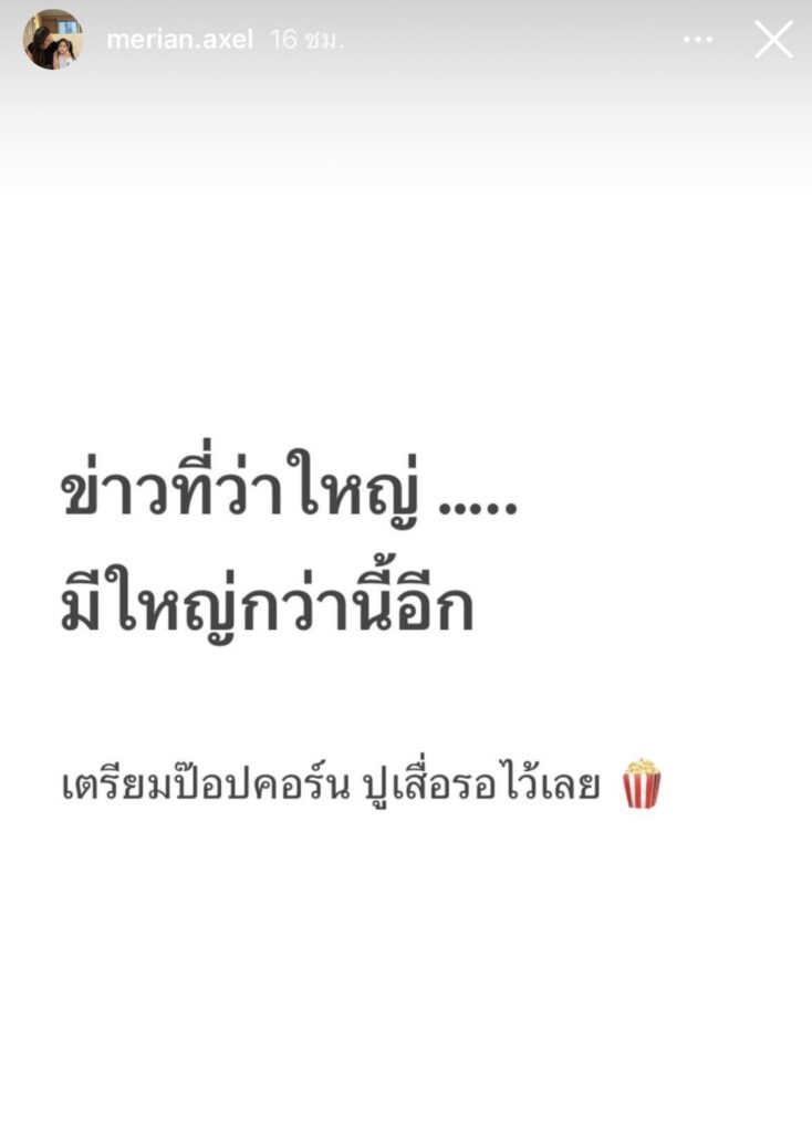 ตกเป็นประเด็นที่ชาวเน็ตให้ความสนใจ สำหรับกรณีของ “มิเรียน” แฟนสาวของพิธีกรดัง “พีเค ปิยะวัฒน์” ได้ออกมาโพสต์ข้อความลงในไอจีสตอรี่ “ข่าวที่ว่าใหญ่…..มีใหญ่กว่านี้อีก เตรียมป๊อปคอร์น ปูเสื่อรอไว้เลย”