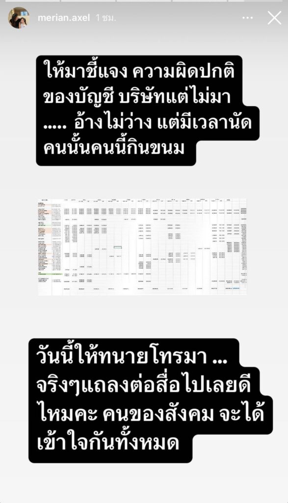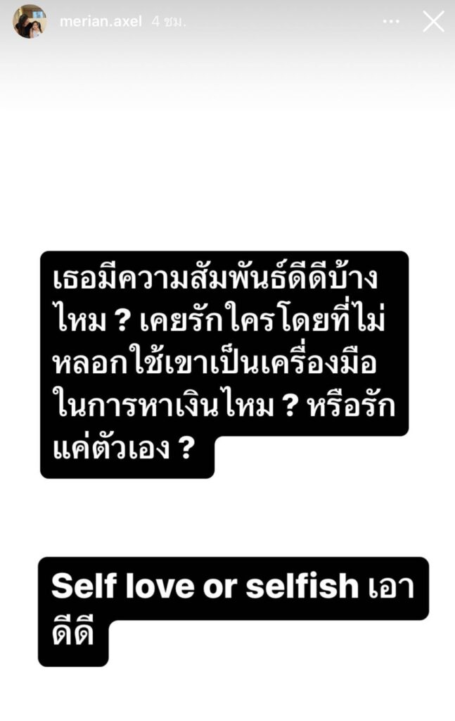 ต่อมาเธอก็ออกมาโพสต์สตอรี่อีกครั้ง พร้อมเขียนข้อความว่า “เธอมีความสัมพันธ์ดีๆบ้างไหม? เคยรักใคร โดยที่ไม่ได้หลอกใช้เขาเป็นเครื่องมือในการหาเงินไหม? หรือ รักแค่ตัวเอง? Self love or selfish เอาดีดี” และโพสต์อีกสตอรี่ว่า “ให้มาชี้แจงความผิดปกติของบัญชี…แต่ไม่มา อ้างไม่ว่างแต่มีเวลานัดคนนั้นคนนี้มากินขนม วันนี้จะให้ทนายโทรมา จริงๆแถลงต่อหน้าสื่อไปเลยดีไหมค่ะ คนของสังคมจะได้เข้าใจกันหมด”