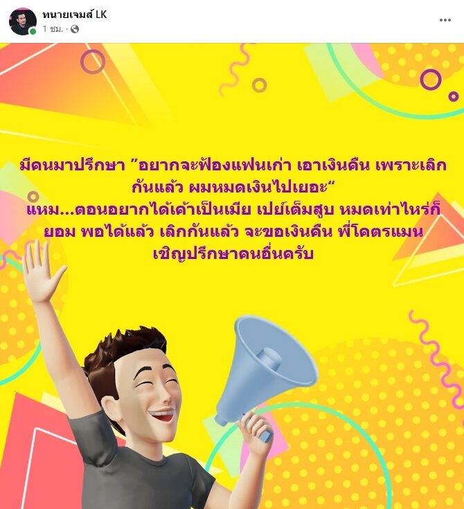 โดยการโพสต์ข้อความผ่านเฟซบุ๊คว่า “มีคนมาปรึกษา “อยากจะฟ้องแฟนเก่า เอาเงินคืน เพราะเลิกกันแล้ว ผมหมดเงินไปเยอะ”