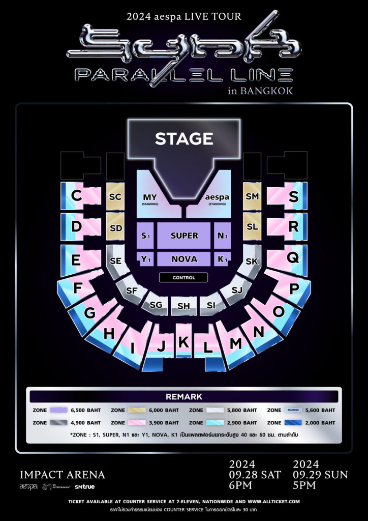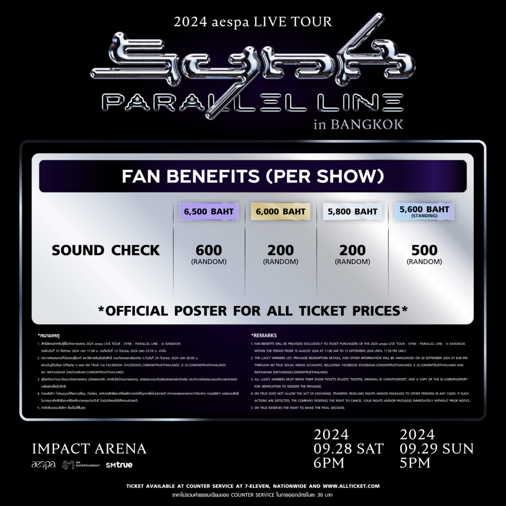 เปิดจำหน่ายบัตรรอบสมาชิก “MY” Membership (GL) Pre-Sale ในวันเสาร์ที่ 10 สิงหาคม 2024 เวลา 11:00 น. – 20:59 น. ทางเว็บไซต์เท่านั้น และรอบบุคคลทั่วไป (General Sale) ในวันอาทิตย์ที่ 11 สิงหาคม 2024 ตั้งแต่เวลา 11:00 น. เป็นต้นไป ทางเคาน์เตอร์เซอร์วิสในร้าน 7-Eleven ทุกสาขาทั่วประเทศ และทางเว็บไซต์ www.allticket.com/event/aespaLIVETOUR2024_inBKK บัตรราคา 6,500 / 6,000 / 5,800 / 5,600 (บัตรยืน) / 4,900 / 3,900 / 2,900 / 2,000 บาท พร้อมสิทธิพิเศษสำหรับผู้ซื้อบัตร ติดตามข่าวสารและรายละเอียดเพิ่มเติมได้ทางบัญชีโซเชียล มีเดียต่าง ๆ ของ SM True : Facebook (เฟซบุ๊ก) facebook.com/smtruethailand, Instagram (อินสตาแกรม) instagram.com/smtruethailand, X (เอ็กซ์) x.com/SMTrueThailand และ TikTok (ติ๊กต๊อก) tiktok.com/@smtruethailand สอบถามข้อมูลเพิ่มเติมเกี่ยวกับการซื้อบัตรได้ทาง Counter Service : อีเมล [email protected] และไลน์ @counterservice