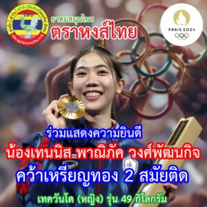 1 เหรียญทอง (เทนนิส พาณิภัค วงศ์พัฒนกิจ เทควันโด 49 กก. หญิง)