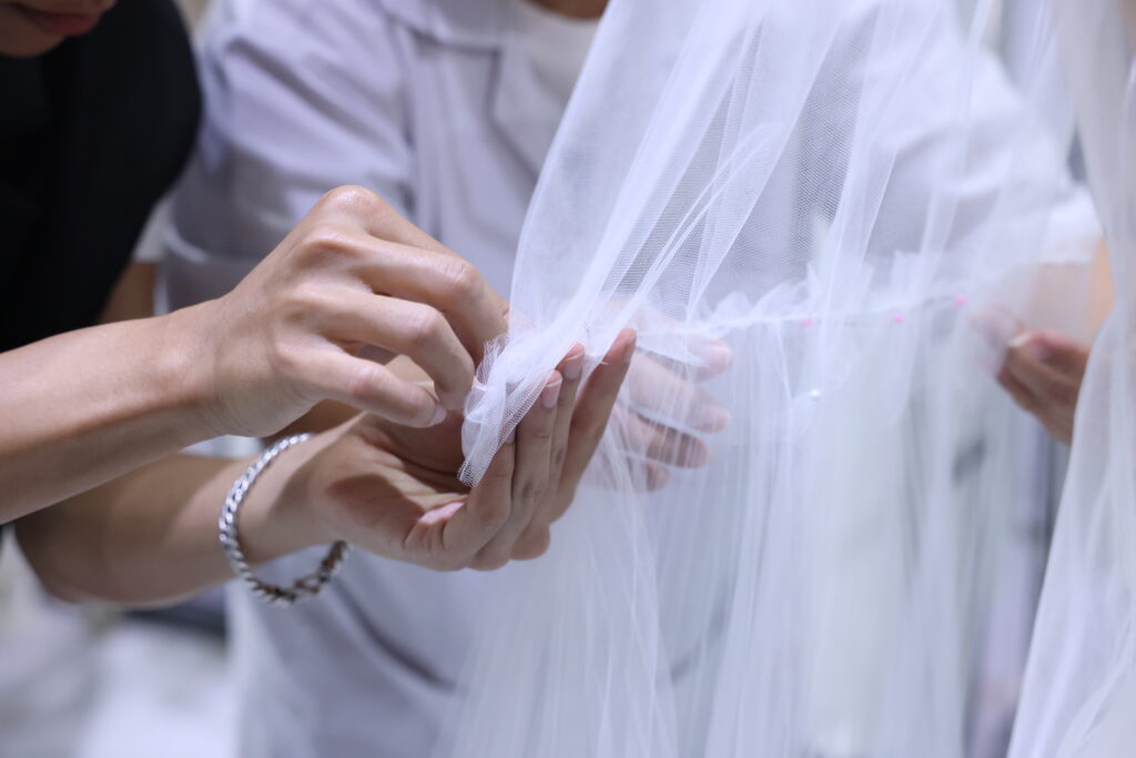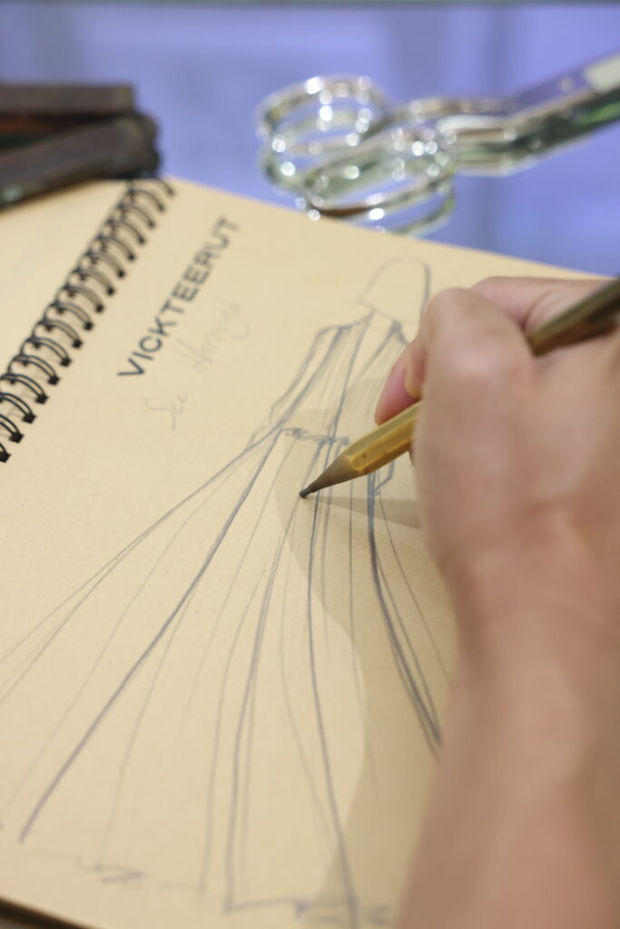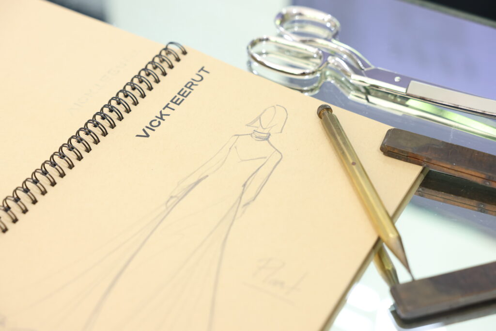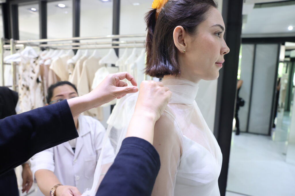 งานนี้ คุณแป้ง – อรประพันธ์ สุทธินรเศรษฐ์ ครีเอทีฟไดเรคเตอร์แห่งเเบรนด์ VICKTEERUT ได้กล่าวถึงการออกแบบชุดในครั้งนี้ให้ฟังเพิ่มเติมว่า “เป็นการพูดคุยกันระหว่างพี่แป้งกับแมทว่าอยากได้ชุดสไตล์ไหน เขาบอกว่าเขาชอบชุด VICKTEERUT อยู่ชุดหนึ่ง ซึ่งอยากให้ชุดแต่งงานออกมาคล้ายกับชุดนั้น และปรับชุดอย่างไรให้ดูเป็นตัวเขามากที่สุด และพี่มองว่าบุคลิกของแมทนั้นคนอื่นจะมองดูว่าเป็นผู้หญิงห้าว แต่จริง ๆ แล้วเค้ามีความห้าวที่ผสมหวาน เขาดูเป็นผู้หญิงแนว Aesthetic หรือบางอย่างที่ดูอาจจะไม่เข้ากัน แต่พอมารวมตัวกันแล้วพอดี เลยออกมาเป็นชุดนี้ โดยชุดยังคงโดดเด่นด้วยเส้นสายและโครงสร้างที่เนี้ยบคม รวมทั้งเด่นชัด นอกจากนี้ยังมีการเลือกใช้ผ้าที่มีความซีทรูบางเบามาใช้กับเสื้อผ้าหลากชิ้นให้มีความเลเยอร์ มีความฟุ้ง มีความฝัน มีความเจ้าสาวอยู่ แต่ช่วงชายกระโปรงจะเป็นผ้าที่ตกแต่งระบายอัดพลีท ที่มาช่วยสร้างลวดลายกราฟฟิกให้ดูน่าสนใจ ซึ่งเป็นซิกเนเจอร์ของแบรนด์ ผสมผสานทำให้ชุดดูมีความโรแมนติกมากขึ้นอีกด้วย”
