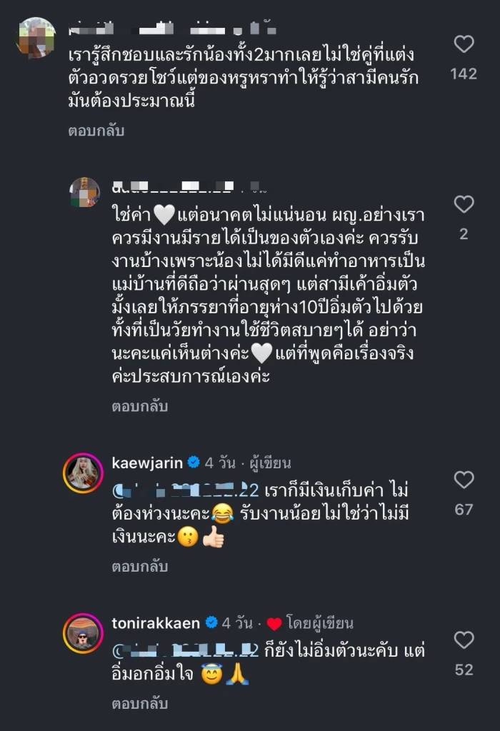งานนี้ทำเอา “แก้ว จริญญา” ทนไม่ได้รีบเข้ามาตอบกลับด้วยตัวเองว่า “เราก็มีเงินเก็บค่า ไม่ต้องห่วงนะคะ รับงานน้อยไม่ใช่ว่าไม่มีเงินนะคะ” ขณะที่”โทนี่ รากแก่น” ก็เข้ามาตอบเพิ่มอีกว่า “ก็ยังไม่อิ่มตัวนะคับ แต่อิ่มอกอิ่มใจ”