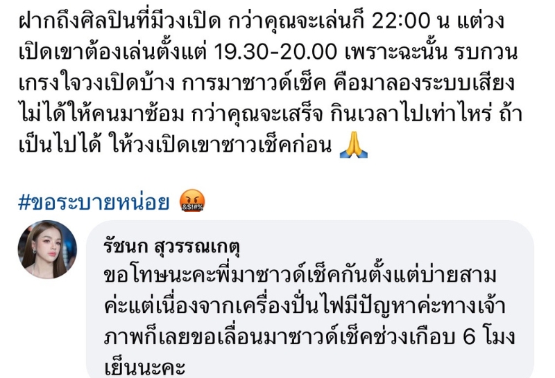 จากกรณีที่มีนักดนตรีรายหนึ่งโพสต์โซเชียล “ฝากถึงศิลปินที่มีวงเปิด กว่าคุณจะเล่นก็ 22:00 น. แต่วงเปิดเขาต้องเล่นตั้งแต่ 19.30-20.00 เพราะฉะนั้น รบกวนเกรงใจวงเปิดบ้าง การมาชาวด์เช็ค คือมาลองระบบเสียง ไม่ได้ให้คนมาช้อม กว่าคุณจะเสร็จ กินเวลาไปเท่าไหร่ ถ้าเป็นไปได้ ให้วงเปิดเขาชาวเช็คก่อน #ขอระบายหน่อย”