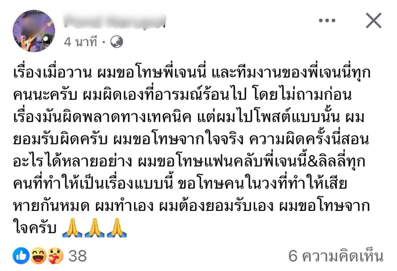 ล่าสุดทางคู่กรณีได้โพสต์ขอโทษทาง “เจนนี่ – ลิลลี่” ว่า “เรื่องเมื่อวาน ผมขอโทษพี่เจนนี่ และทีมงานของพี่เจนนี่ทุกคนนะครับ ผมผิดเองที่อารมณ์ร้อนไป โดยไม่ถามก่อน เรื่องมันผิดพลาดทางเทคนิค แต่ผมไปโพสต์แบบนั้น ผมยอมรับผิดครับ ผมขอโทษจากใจจริง ความผิดครั้งนี่สอนอะไรได้หลายอย่าง ผมขอโทษแฟนคลับพี่เจนนี้&ลิลลี่ทุกคนที่ทำให้เป็นเรื่องแบบนี้ ขอโทษคนในวงที่ทำให้เสียหายกันหมด ผมทำเอง ผมต้องยอมรับเอง ผมขอโทษจากใจครับ 🙏🙏🙏”