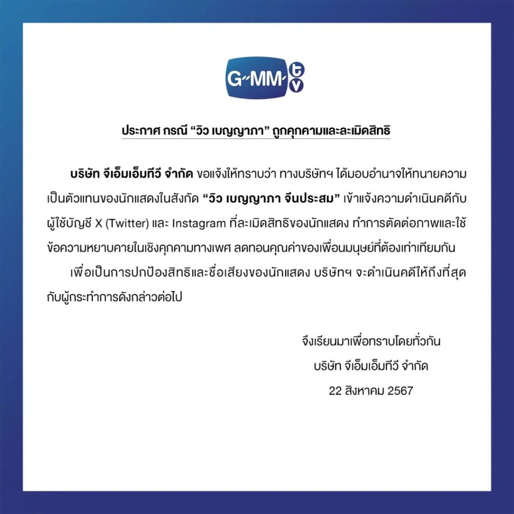 บริษัท จีเอ็มเอ็มทีวี จำกัด ขอแจ้งให้ทรามว่า ทางบริษัทฯ ได้มอบอำนาจให้ทนายความเป็นตัวแทนของนักแสดงในสังกัด “วิว เบญญาภา จีนประสม” เข้าแจ้งความดำเนินคดีกับผู้ใช้บัญชี X (Twitter) และ Instagram ที่ละเมิดสิทธิของนักแสดง ทำการตัดต่อภาพและใช้ข้อความหยาบคายในเชิงคุกคามทางเพศ ลดทอนคุณค่าของเพื่อนมนุษย์ที่ต้องเท่าเทียมกัน