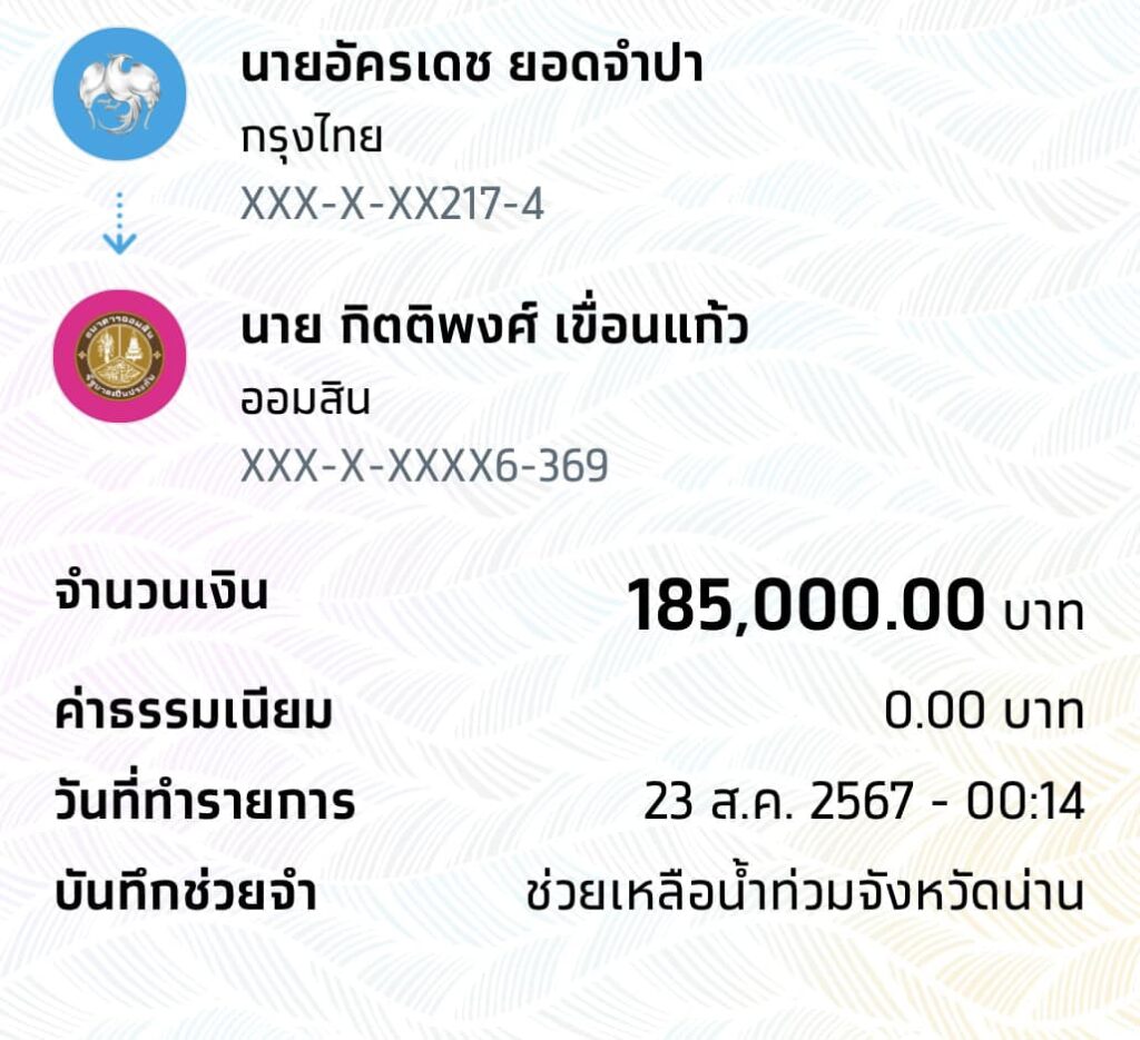 ล่าสุดเจ้าตัวก็ออกมาโพสต์สลิปเงินยอดบริจาค พร้อมเขียนข้อความว่า “เงินก้อนนี้จะถูกนำไปซื้อน้ำดื่ม ยารักษาโรคของใช้จำเป็น และทำข้าวกล่อง แจกจ่ายให้กับพี่น้องชาวจังหวัดน่านที่ได้รับผลกระทบจากน้ำท่วม เดี๋ยวจะอัพเดทให้ทุกท่านได้เห็นเรื่อยๆ ครับ 185,000 บาท”