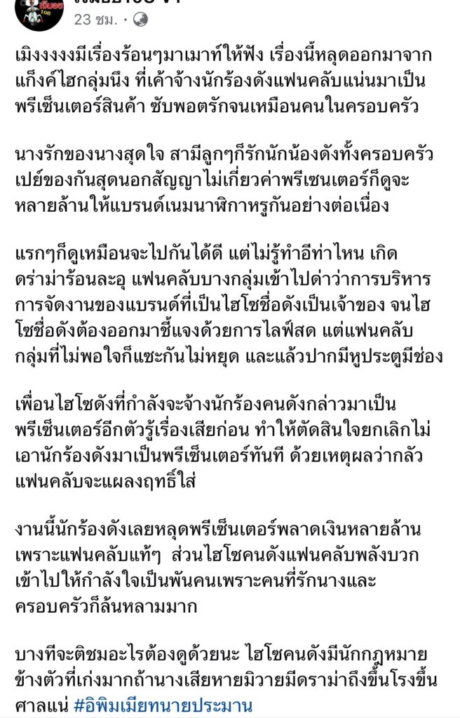 โดย เจ๊มอย 108 เม้าท์เอาไว้แรงว่า … “เมิงงงงงมีเรื่องร้อนๆมาเมาท์ให้ฟัง เรื่องนี้หลุดออกมาจากแก็งค์ไฮกลุ่มนึง ที่เค้าจ้างนักร้องดังแฟนคลับแน่นมาเป็นพรีเซ็นเตอร์สินค้า ซับพอตรักจนเหมือนคนในครอบครัว นางรักของนางสุดใจ สามีลูกๆก็รักนักน้องดังทั้งครอบครัว เปย์ของกันสุดนอกสัญญาไม่เกี่ยวค่าพรีเซนเตอร์ก็ดูจะหลายล้านให้แบรนด์เนมนาฬิกาหรูกันอย่างต่อเนื่อง