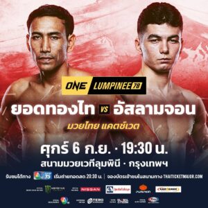 ยอดทองไท ส.สมหมาย มวยขวามากฝีมือ วัย 31 ปี จาก สตูล เตรียมขึ้นสังเวียนไล่ล่าชัยชนะที่ 4 โดยจะต้องดวลกับ “อัสลามจอน ออร์ติคอฟ” นักสู้ดาวรุ่งวัย 21 ปี จาก อุซเบกิสถาน ที่คว้าชัย 4 ไฟต์รวดในรายการนี้ โดยทั้งคู่จะสู้กันกันในกติกามวยไทย พิกัดเฉพาะ (แคตช์เวต) 130 ป. ในศึก ONE ลุมพินี 78 วันศุกร์ที่ 6 ก.ย.นี้ ที่สนามมวยเวทีลุมพินี (รามอินทรา) คู่แรกเริ่มเวลา 19.30 น.