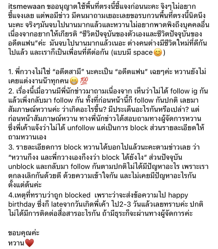 “หวานก็งง และพี่กวางเองก็งงว่า block ได้ยังไง“ ส่วนปัจจุบัน unblock และกลับมา follow กันตามปกติไม่ได้มีปัญหาอะไร เพราะเราตกลงเลิกกันด้วยดี ด้วยความเข้าใจกัน และไม่เคยมีปัญหาอะไรกันตั้งแต่ต้นค่ะ
