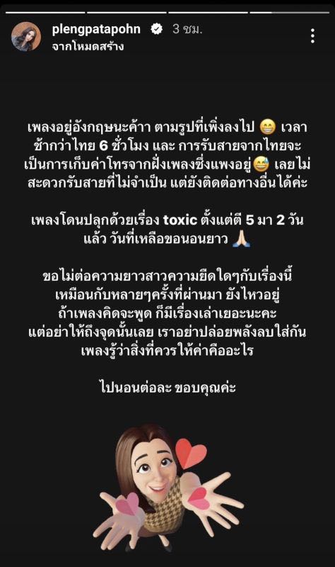 และอีกข้อความว่า “เพลงอยู่อังกฤษนะค้าา ตามรูปที่เพิ่งลงไป เวลาช้ากว่าไทย 6 ชั่วโมง และ การรับสายจากไทยจะเป็นการเก็บค่าโทรจากฝั่งเพลงซึ่งแพงอยู่ เลยไม่สะดวกรับสายที่ไม่จำเป็น แต่ยังติดต่อทางอื่นได้ค่ะเพลงโดนปลุกด้วยเรื่อง toxic ตั้งแต่ตี 5 มา 2 วันแล้ว วันที่เหลือขอนอนยาว ขอไม่ต่อความยาวสาวความยืดใดๆ กับเรื่องนี้เหมือนกับหลายๆ ครั้งที่ผ่านมา ยังไหวอยู่ ถ้าเพลงคิดจะพูด ก็มีเรื่องเล่าเยอะนะคะแต่อย่าให้ถึงจุดนั้นเลย เราอย่าปล่อยพลังลบใส่กันเพลงรู้ว่าสิ่งที่ควรให้ค่าคืออะไร ไปนอนต่อละ ขอบคุณค่ะ”