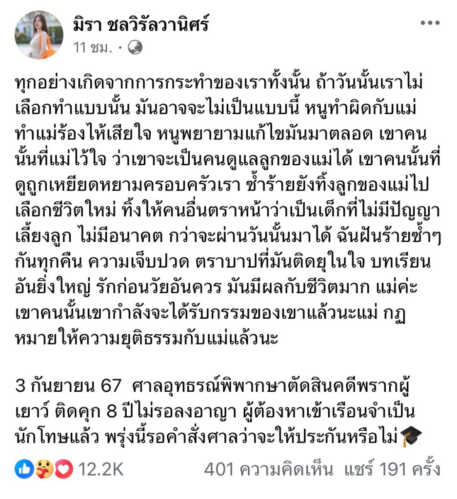 ล่าสุด “เอ๋ มิรา” ได้เคลื่อนไหวผ่านเฟซบุ๊กส่วนตัว โพสต์ข้อความ หนูทำผิดกับแม่ ทำให้แม่ร้องไห้ เป็นตราบาปในใจ เขาคนนั้นกำลังได้รับกรรมของเขาแล้ว “ทุกอย่างเกิดจากการกระทำของเราทั้งนั้น ถ้าวันนั้นเราไม่เลือกทำแบบนั้น มันอาจจะไม่เป็นแบบนี้ หนูทำผิดกับแม่ ทำแม่ร้องไห้เสียใจ หนูพยายามแก้ไขมันมาตลอด เขาคนนั้นที่แม่ไว้ใจ ว่าเขาจะเป็นคนดูแลลูกของแม่ได้ เขาคนนั้นที่ดูถูกเหยียดหยามครอบครัวเรา ซ้ำร้ายยังทิ้งลูกของแม่ไปเลือกชีวิตใหม่ ทิ้งให้คนอื่นตราหน้าว่าเป็นเด็กที่ไม่มีปัญญาเลี้ยงลูก ไม่มีอนาคต กว่าจะผ่านวันนั้นมาได้ ฉันฝันร้ายซ้ำๆกันทุกคืน ความเจ็บปวด ตราบาปที่มันติดยุในใจ บทเรียนอันยิ่งใหญ่ รักก่อนวัยอันควร มันมีผลกับชีวิตมาก แม่ค่ะ เขาคนนั้นเขากำลังจะได้รับกรรมของเขาแล้วนะแม่ กฏหมายให้ความยุติธรรมกับแม่แล้วนะ