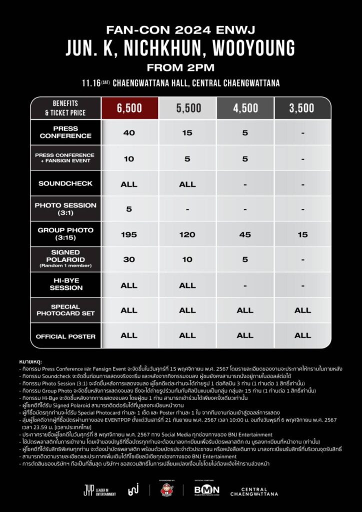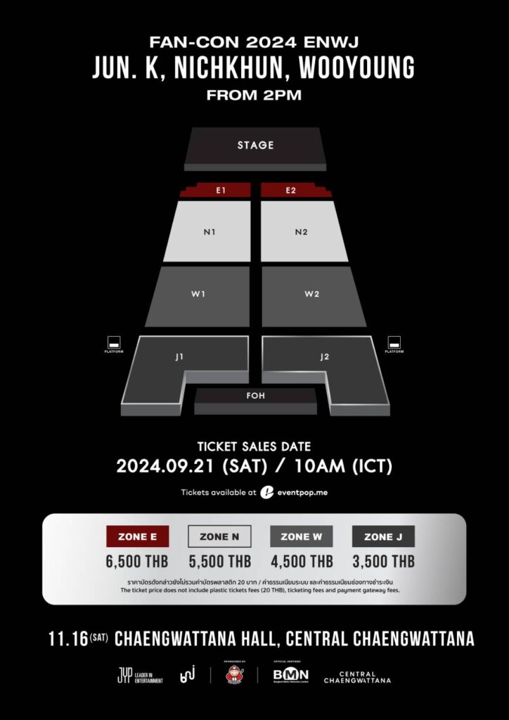โดยงาน “JUN. K, NICHKHUN, WOOYOUNG (From 2PM) Fan-Con 2024 [ENWJ] in Bangkok” จะเปิดจำหน่ายบัตรในวันเสาร์ที่ 21 กันยายน 2567 เวลา 10:00 น. เป็นต้นไป บัตรราคา 6,500 / 5,500 / 4,500 และ 3,500 บาท
