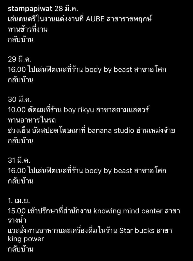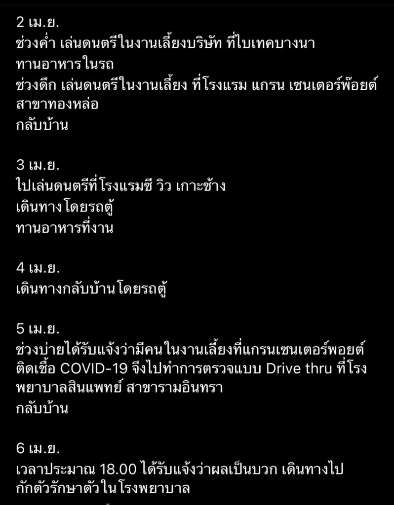 ผมได้ทำการเรียบเรียงไทม์ไลน์อย่างละเอียด เพื่อแจ้งให้กับเจ้าหน้าที่เป็นที่เรียบร้อยแล้วครับ ผมอยากขอนำไทม์ไลน์มาแจ้งให้ทุกคนทราบด้วย เพื่อให้บุคคลที่มีโอกาสได้ใกล้ชิดกับผม หรืออยู่ในสถานที่ที่ผมไปในช่วงเวลาที่ผ่านมานี้ ได้ระมัดระวังตัว และรีบเดินทางไปตรวจหาเชื้อกันต่อไปกันได้เร็วที่สุดครับ