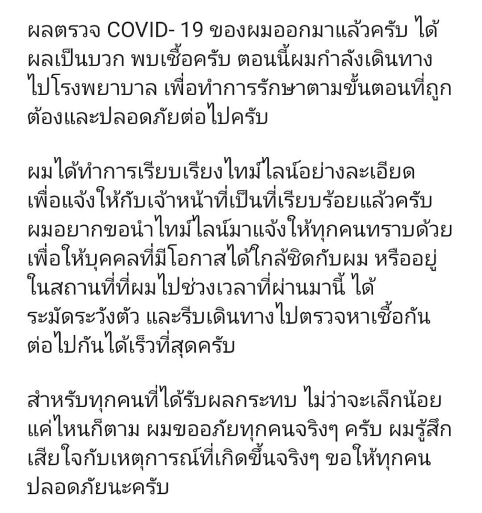 “ผลตรวจ COVID-19 ของผมออกมาแล้วครับ ได้ผลเป็นบวก พบเชื้อครับ ตอนนี้ผมกำลังเดินทางไปโรงพยาบาล เพื่อทำการรักษาตามขั้นตอนที่ถูกต้องและปลอดภัยต่อไปครับ