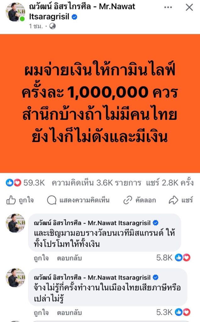 ล่าสุดหนึ่งในผู้ใหญ่ที่เคยร่วมงานกับทั้งคู่อย่าง “ณวัฒน์ อิสรไกรศีล” ได้ออกมาเคลื่อนไหว โพสต์ฟาดจุกๆว่า “ผมจ่ายเงินให้กามินไลฟ์ครั้งละ 1 ล้าน ควรสำนึกบ้าง ถ้าไม่มีคนไทย ยังไงก็ไม่ดังและมีเงิน”