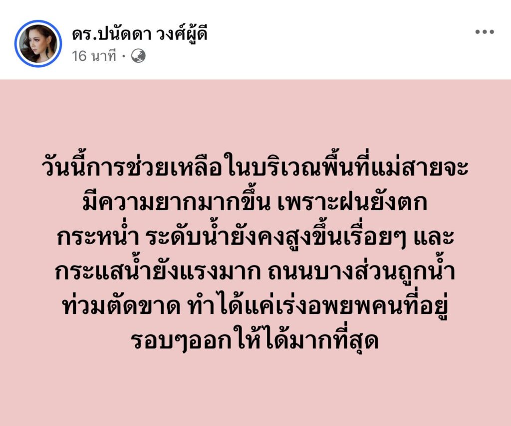 “บุ๋ม ปนัดดา” ลงพื้นที่ช่วยเหลือน้ำท่วมที่เชียงราย อัพเดทสถานการณ์อย่างต่อเนื่อง ชาวเน็ตแห่ส่งกำลังใจ
