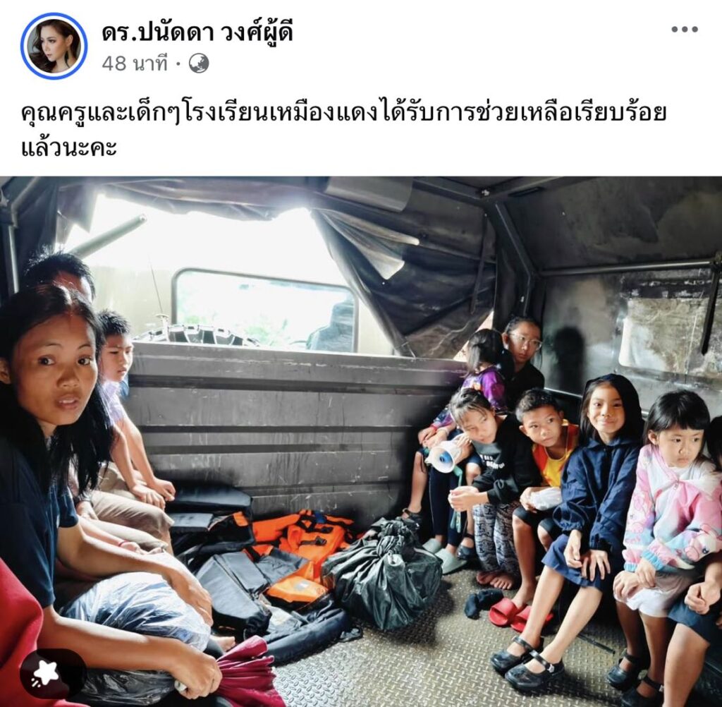 ล่าสุดสาว “บุ๋ม” ก็ออกมาอัพเดทสถานการณ์อย่างใกล้ชิด โดยการโพสต์ภาพเด็กๆนั่งบนรถ พร้อมเขียนข้อความว่า “คุณครูและเด็กๆโรงเรียนเหมืองแดงได้รับการช่วยเหลือเรียบร้อยแล้วนะคะ” “วันนี้การช่วยเหลือในบริเวณพื้นที่แม่สายจะมีความยากมากขึ้น เพราะฝนยังตกกระหน่ำ ระดับน้ำยังคงสูงขึ้นเรื่อยๆ และกระแสน้ำยังแรงมาก ถนนบางส่วนถูกน้ำท่วมตัดขาด ทำได้แค่เร่งอพยพคนที่อยู่รอบๆออกให้ได้มากที่สุด” และโพสต์ต่อว่า “คุณลุงที่ติดเกาะบนหลังคามีทีมเจ็ทสกี เข้าไปช่วยได้รับการช่วยเหลือเรียบร้อยแล้วนะคะ คุณลุงปลอดภัยแล้วค่ะ ขอบคุณทีมที่เข้าไปช่วยคุณลุงด้วยนะคะ”