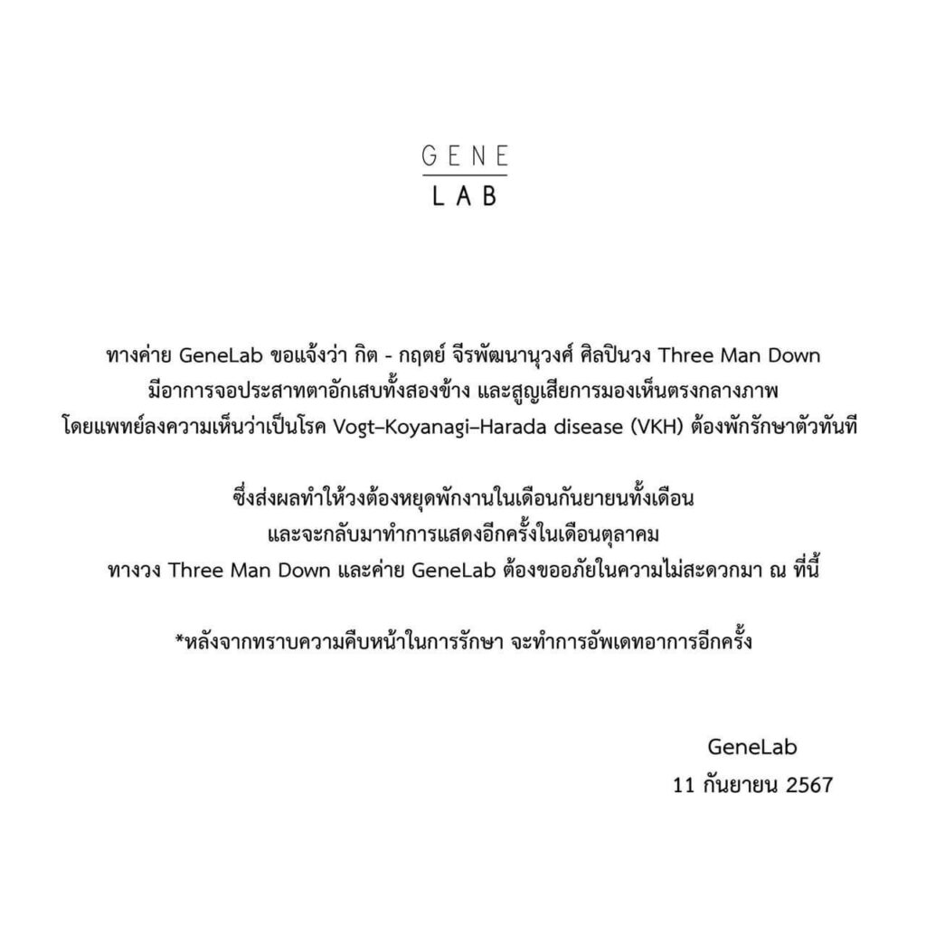 ข้ามมาที่นักร้องหนุ่ม “กิต Three Man Down” ทำเอาแฟนคลับส่งกำลังใจให้แบบรั่วๆ เมื่อทางด้านต้นสังกัดของนักร้องหนุ่ม “กิต” ได้ออกมาประกาศพักงานเดือนกันยายน เนื่องจากนักร้องหนุ่มมีอาการจอประสาทตาอักเสบทั้งสองข้าง และสูญเสียการมองเห็นตรงกลางภาพ ต้องพักรักษาตัวทันที ซึ่งส่งผลทำให้วงต้องหยุดพักงานในเดือนกันยายนทั้งเดือน และจะกลับมาทำการแสดงอีกครั้งในเดือนตุลาคม
