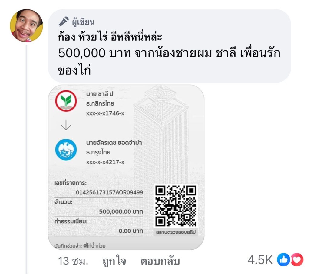 โดย “ก้อง ห้วยไร่” ได้โพสต์สลิปการโอนเงิน พร้อมเขียนข้อความว่า “500,000 บาท Charlie Potjes มึงบอกกูว่าห้ามแท็ก มึงคิดว่ากูจะฟังมึงเหรอ เงินไม่ใช่น้อยๆ จะนำเอาความไว้ใจ ไปส่งให้ถึงมือพี่น้องเชียงรายครับเพื่อนรัก”